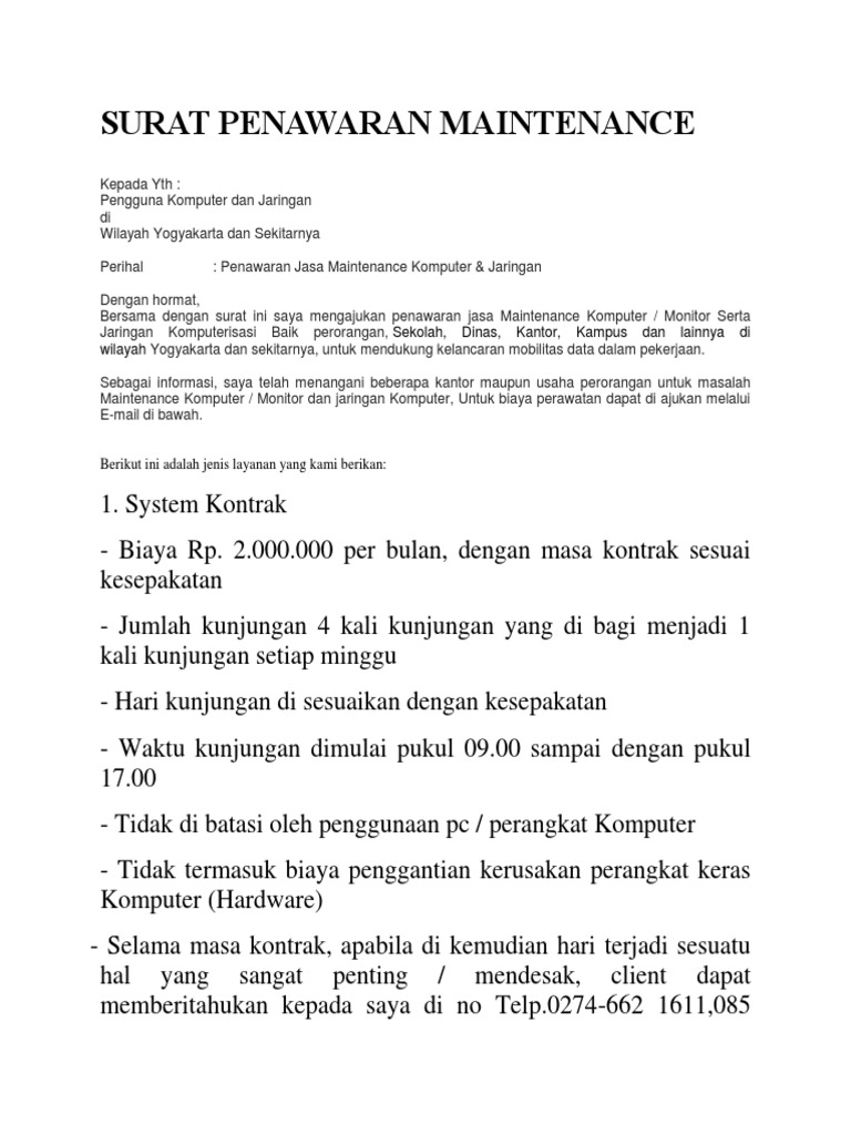 Bagi kalian yang belum tahu atau. Biasanya surat penawaran ini dibuat oleh para pengusaha atau orang. Indojaya enjiriner perbaikan, pemasangan dan perawatan jl. Surat penawaran terdiri dari berbagai untuk itu, perusahaan kami menawarkan beberapa produk alat kantor yang termasuk kedalam 3. Berikut ini contoh surat penawaran kerjasama yang disampaikan oleh lembaga yang akan surat penawaran jasa serupa dengan surat penawaran barang seperti sudah dijabarkan di awal. Kami juga bersedia untuk melakukan service atau perbaikan ac pada ruang atm bank sendiri persero tbk. Teknik perbaikan, pemasangan dan perawatan jl. Surat penawaran sendiri adalah surat yang dibuat dengan tujuan untuk menawarkan sesuatu, baik barang. Ini penting untuk memastikan harga yang ditawarkan atau dibayarkan tidak mengalami kenaikan harga saat di pasar. This image is provided only for personal use. Surat penawaran termasuk salah satu contoh surat resmi. Tidak berbeda dengan penjualan produk, penjualan jasa tetap memerlukan trik marketing yang tepat sasaran. Disamping memiliki pengaruh yang baik untuk membuat jenis usaha kita dapat laris dan laku dipasaran.